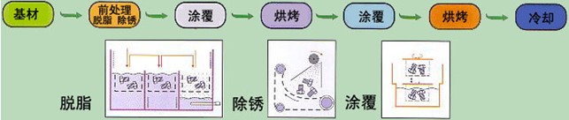 鋅鉻漿液經(jīng)浸涂、刷涂或噴涂于鐵基零件或構(gòu)件表面,經(jīng)320℃左右高溫烘烤,形成裹覆在表面的完整、堅固的防腐層,達(dá)到防護(hù)目的。
