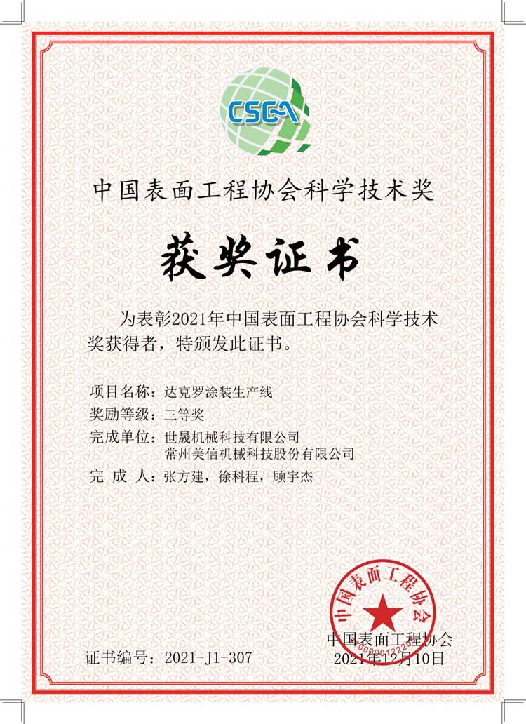 熱烈祝賀世晟集團子公司(達克羅涂裝生產(chǎn)線項目)喜獲2021年度“中國表面工程協(xié)會科學(xué)技術(shù)獎”三等獎