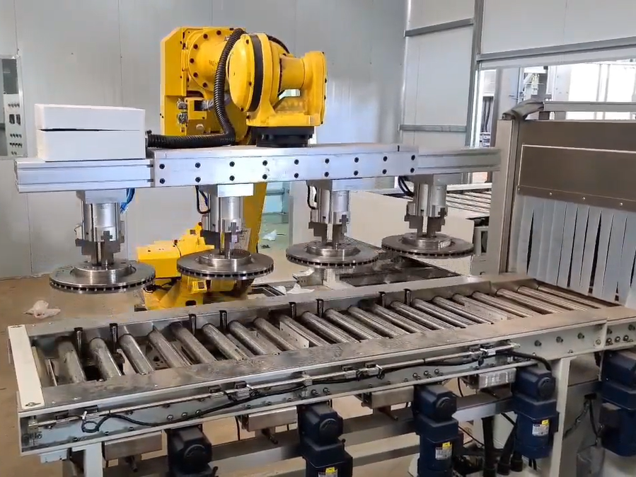 剎車盤(pán)轉(zhuǎn)送到涂裝車間的上線位置,用帶有視覺(jué)識(shí)別系統(tǒng)的機(jī)器人進(jìn)行上線。