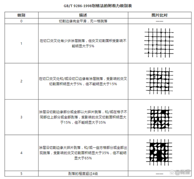 評(píng)級(jí)方法:在良好照明的環(huán)境下,目視檢查測(cè)試面涂層的脫落情況。附著力共分6個(gè)等級(jí),從0級(jí)到5級(jí)涂層附著力依次遞減,5級(jí)最差。GB/T 9286-1998劃格法的附著力級(jí)別見下表。