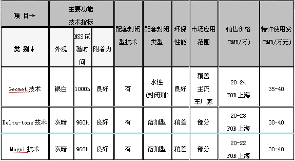 對(duì)Geomet系列、Delta-Tone系列、Magni系列三項(xiàng)無(wú)鉻技術(shù)進(jìn)行比較,Geomet無(wú)鉻涂料底涂、面涂均為水性涂料,且Geoemt技術(shù)得到國(guó)際幾乎所有主流汽車廠家的認(rèn)可,而Delta-Tone系列和Magni系列底涂為水性涂料,但面涂仍為有機(jī)溶劑型涂料,只是僅被部分廠商認(rèn)可。